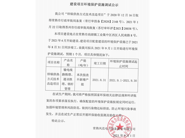建设项目环境保护设施调试公示(锌锅供热技改)(1)